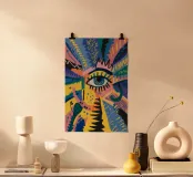 A large, detailed eye sits at the center of an explosion of color and patterns. Surrounded by swirling pink, blue, and yellow tones, the composition emphasizes perception and insight.