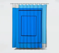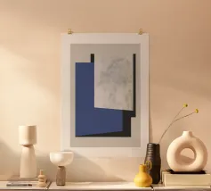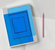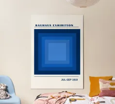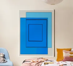 Questo dipinto astratto presenta una composizione geometrica minimalista basata sulla sovrapposizione di quadrati e rettangoli. La tavolozza dei colori è limitata a diverse tonalità di blu, da un ciano chiaro a un intenso blu medio. Un rettangolo più grande di colore azzurro è parzialmente coperto da un quadrato più scuro, che a sua volta contiene un quadrato più piccolo, centrato, del colore blu più scuro. I contorni neri sottolineano il quadrato centrale e quello interno, creando profondità e precisione visiva. L'opera emana calma e chiarezza.