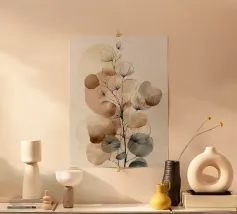 A soft, abstract watercolor composition featuring gentle greens, warm ochres, and translucent taupes. The delicate layering of shapes and stems creates a meditative, organic impression — ideal for minimalist, wabi-sabi, or nature-inspired interiors.