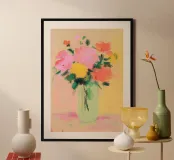 Un dipinto astratto mostra un vaso verde chiaro con fiori rosa, arancioni, gialli e verdi su uno sfondo rosa chiaro. Le diverse forme dei fiori e le pennellate visibili su uno sfondo giallo-arancio conferiscono all'opera consistenza, profondità e vividi contrasti di colore.