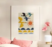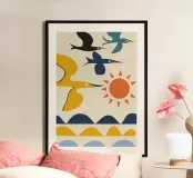 Abstract birds in flight above stylized waves and a setting sun, blending warm and cool tones in a modern artistic composition.