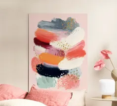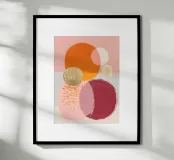 Un dipinto astratto caratterizzato da forme circolari sovrapposte e texture delicate. La tavolozza di colori caldi aggiunge profondità e morbidezza, rendendolo un raffinato punto focale per gli spazi moderni.