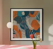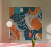 A beautiful abstract pattern features flowing, wavy lines and organic shapes with textured details in a calming palette of blue, orange, and beige, suggesting gentle, rolling waves or hills.
