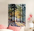 A radiant watercolor capturing the first light of day streaming through a dense pine forest. Rich shadows, golden glow, and cool forest tones create a cinematic composition that balances stillness with warmth, perfect for nature lovers, woodland-inspired interiors, or seasonal wall decor.