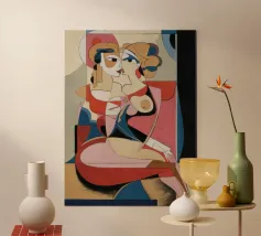 Quest'opera d'arte presenta una composizione contemplativa e introspettiva con un mix di forme geometriche e organiche. La tavolozza dei colori comprende blu, rosso e beige, creando un senso di equilibrio e armonia. La disposizione ponderata di forme e colori ne fa un'opera accattivante.