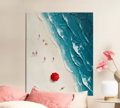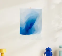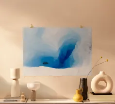This artwork presents a poetic aerial view of small figures crossing a vast frozen surface, rendered in soft blues and textured whites. The cracked, layered ice forms abstract patterns that resemble natural maps, while the tiny human silhouettes introduce movement, scale, and quiet narrative. Long shadows stretch across the surface, emphasizing distance and stillness. Balancing abstraction and realism, the composition reflects themes of fragility, exploration, and human presence within immense natural spaces, making it a refined piece for contemporary interiors and large-format fine art prints