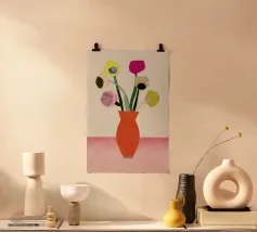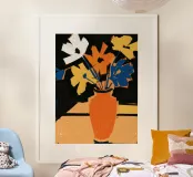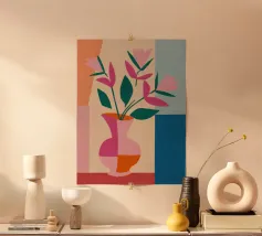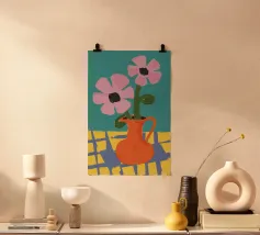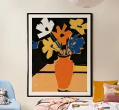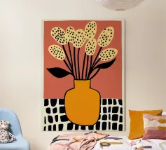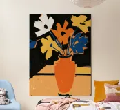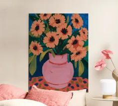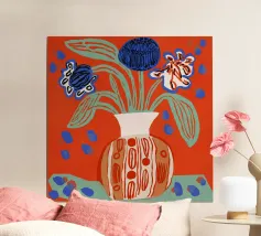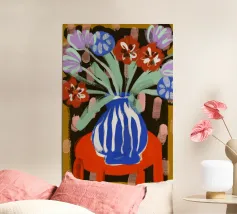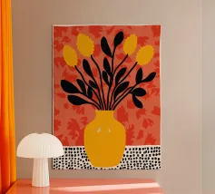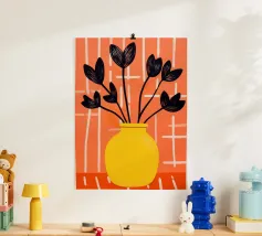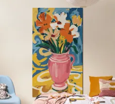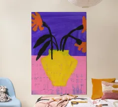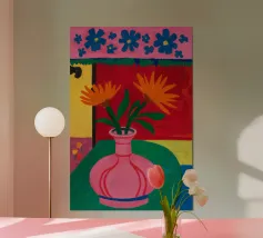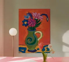 Un'opera d'arte astratta vibrante ed espressiva con una fusione di colori audaci di ispirazione fauvista come il magenta, l'arancione e il nero. Le pennellate e le forme energiche creano un'opera dinamica e appassionata.