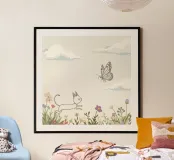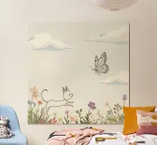 Gatto insegue farfalla in un prato fiorito sotto un cielo morbido poster