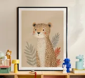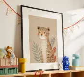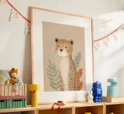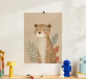 A sweet and softly detailed leopard sits calmly against a warm beige background, surrounded by muted botanical leaves in sage green and soft terracotta tones. With delicate spotted fur, rosy cheeks, and a gentle expression, this charming illustration brings a cozy and comforting feeling to any nursery or child’s room.