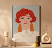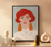 A simple and clean portrait of a young woman with vibrant red hair and stylish orange earrings, looking directly at the viewer with a gentle expression.