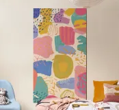Un motivo astratto delicato e giocoso, composto da forme organiche morbide e colorate su uno sfondo chiaro, che crea un disegno rilassante e sottilmente strutturato.