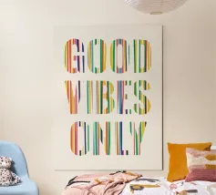 Un messaggio luminoso ed edificante per una casa felice. Questa scritta a mano riporta la classica frase "GOOD VIBES ONLY" su un allegro sfondo a righe.