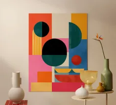 Un sofisticato gioco di forme ed equilibri, questa opera d'arte geometrica astratta combina tonalità tenui di verde acqua, rosa arrossato, senape e crema per creare un senso di calma struttura ed eleganza moderna. Le linee pulite si intersecano con blocchi di colore tenui, formando una composizione ritmica che ricorda il design Bauhaus. Ideale per interni contemporanei alla ricerca di un'estetica architettonica e raffinata.
