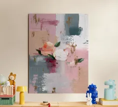 A painterly abstract where floral hints emerge through layered brushstrokes. Soft colors and gentle contrast give this artwork a romantic yet modern presence.