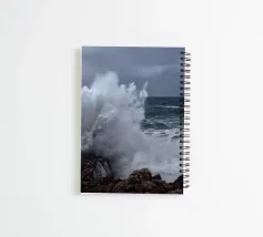 Photograph of a huge wave hitting the rocky Atlantic coast of Portugal.
