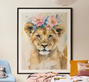Questo moderno disegno raffigura un grazioso leoncino con fiori sulla testa. Disegnato con delicati acquerelli e accenti dorati, unisce la bellezza naturale all'eleganza artistica. Le morbide sfumature di colore e lo stile astratto conferiscono a qualsiasi ambiente un'atmosfera romantica e giocosa, ma allo stesso tempo elegante: un vero e proprio colpo d'occhio per la vostra casa.