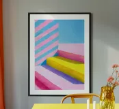 Illustrazione a guazzo di gradini gialli davanti a pareti a strisce rosa-blu-gialle. Sfondo minimalista, linee decise, forme geometriche e composizione chiara. Blocchi di colore vivaci in tonalità pastello di rosa, blu, giallo e bianco creano un'illustrazione astratta, vivace ed estetica.
