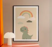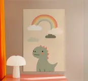 Illustrazione di un simpatico dinosauro e di un arcobaleno poster