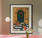 Questo delizioso poster presenta un'illustrazione stilizzata e retrò di una festosa scena di porta urbana. La porta color verde scuro è splendidamente ornata da una classica ghirlanda verde e da un grande fiocco rosso. Tre regali di Natale colorati - rosso, bianco e verde - sono disposti ordinatamente sui gradini innevati sottostanti. L'arco della porta in pietra è reso in un caldo arancione dorato, creando un sorprendente contrasto con i toni freddi dell'inverno. I contorni decisi e la tavolozza di colori limitata ricordano il design grafico e l'arte popolare della metà del secolo, perfetti per aggiungere un tocco di fascino nostalgico e festoso alla vostra casa. Questo quadro di qualità superiore 7000×50