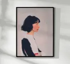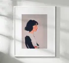 Una donna è raffigurata di profilo, con lo sguardo rivolto in avanti, il corpo calmo e chiuso. La ridotta cromaticità e l'ampio spazio bianco conferiscono al soggetto chiarezza e sobrietà. L'immagine trasmette concentrazione, raccoglimento interiore, presenza. La superficie pittorica rimane visibile e sottolinea la quiete della scena.