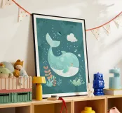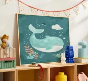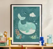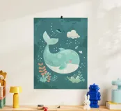 Incantevole immagine subacquea di una balena che nuota tranquillamente poster con telaio in legno