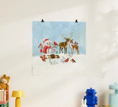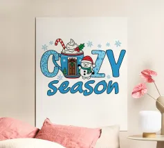 Un allegro pupazzo di neve e un omino di pan di zenzero si trovano accanto a una grande scritta rossa "JOY" ornata da fiocchi di neve e circondata da decorazioni natalizie. Scatole regalo e ornamenti festosi completano il tema stagionale.