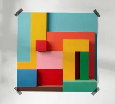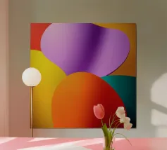 Vibranti forme geometriche in viola, rosso, giallo e blu si sovrappongono su un audace sfondo giallo e scuro, mostrando un'arte astratta dal tocco moderno.
