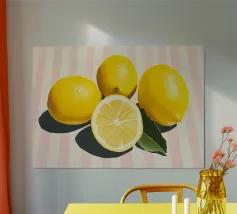 A vibrant oil painting capturing a group of fresh lemons in rich, sunlit hues. The textured brushwork and lifelike detail evoke freshness and warmth, making it a perfect visual celebration of citrus beauty and natural elegance. Ideal for kitchen or any other living or working space.