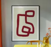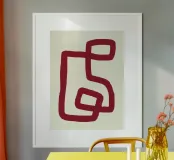 Un'audace linea rossa forma una forma astratta a incastro su uno sfondo color crema. La semplicità e la fluidità contrastano splendidamente con la scelta dei colori.