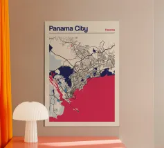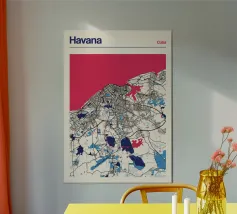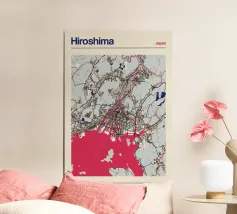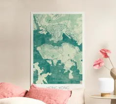 Una mappa artistica di Hong Kong che cattura l'armoniosa combinazione di paesaggio urbano e costa con strutture e colori chiari.
