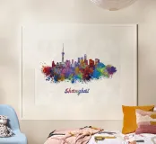 Lo skyline di Shanghai in acquerello poster con telaio in alluminio