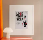 "This illustration, created using stencil technique, imbues any wall with significant meaning by transforming a well-known slogan, inviting deep reflection on self-acceptance and identity. Through the vibrant red colour, the artist conveys a powerful sense of urgency, symbolising the internal struggles we often face. It acts as a mirror for the viewer, challenging them to examine their own relationship with self-love and self-criticism. A piece that undoubtedly leaves a lasting impression."