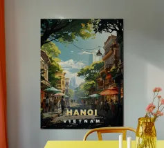 Scoprite Seoul, una città dove la modernità incontra la tradizione. Questo poster mostra una strada vivace fiancheggiata da negozi tradizionali, alberi di ciliegio in fiore e grattacieli sullo sfondo. Una celebrazione dell'energia e del fascino unico della capitale coreana.