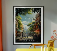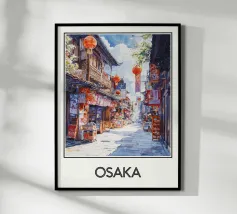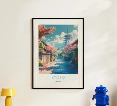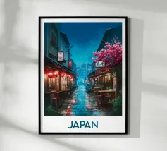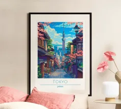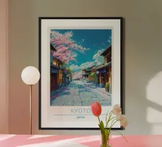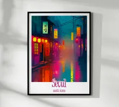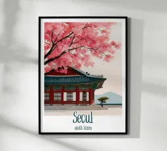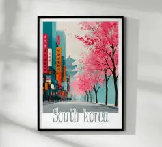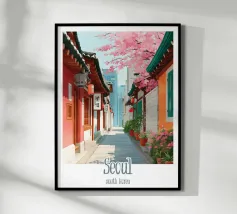 Scoprite Seoul, una città dove la modernità incontra la tradizione. Questo poster mostra una strada vivace fiancheggiata da negozi tradizionali, alberi di ciliegio in fiore e grattacieli sullo sfondo. Una celebrazione dell'energia e del fascino unico della capitale coreana.