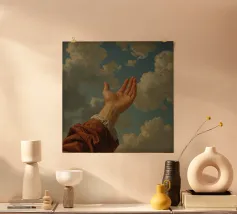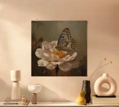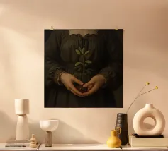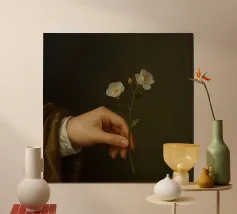 Mano che regge un fiore bianco in una luce soffusa con poster