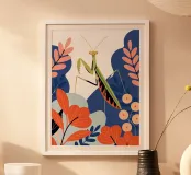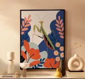 Lasciatevi affascinare dalla bellezza di una mantide religiosa in mezzo a un giardino colorato in questa illustrazione. I colori vivaci e il design dettagliato creano un'atmosfera unica e accattivante.
