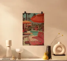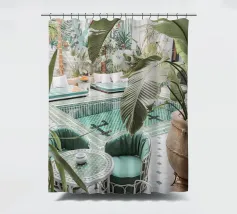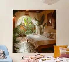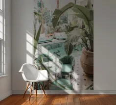 Entrate nel cuore di Marrakech con questa affascinante fotografia di un interno di un riad verde e lussureggiante. Il verde intenso e gli intricati dettagli architettonici creano un'oasi di tranquillità, dove il design tradizionale marocchino incontra la bellezza naturale. Intorno alla piscina del cortile scendono a cascata ricche piante, le cui foglie vibranti contrastano con gli eleganti pavimenti piastrellati. Questa immagine evoca la calma e il fascino di un rifugio marocchino, dove la frenesia della città svanisce e si viene avvolti da una fuga pacifica e verdeggiante.