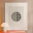 Opera d'arte geometrica minimalista con linee nere e una forma rotonda in verde salvia e texture su sfondo beige.