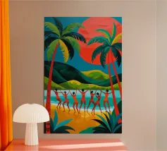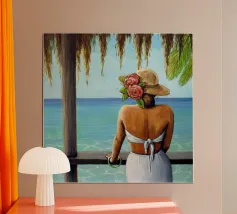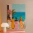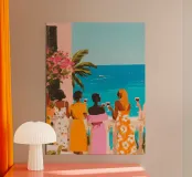 A group of women standing together, gazing out at the ocean. This artwork celebrates friendship, travel, and shared summer moments.