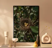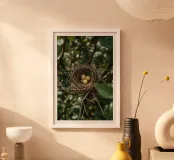Nido di uccelli con uova in un cespuglio poster con telaio in legno