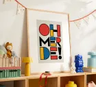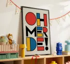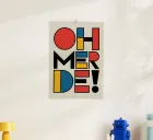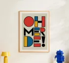 Typography design with the lettering "OH MERDE" on light beige. Each letter consists of geometric shapes in black, yellow, red and blue, arranged in a slightly staggered pattern. Modern, abstract design with a rhythmic, eye-catching colour combination.