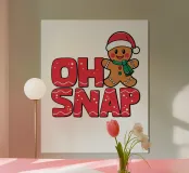 A cheerful gingerbread character wearing a Santa hat and scarf is placed alongside the playful phrase "OH SNAP" in red letters.