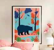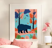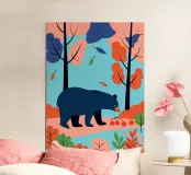 Godetevi la bellezza naturale di una foresta autunnale con questa illustrazione di un orso in cerca di cibo. I colori caldi e il design minimalista creano un'atmosfera pacifica e rasserenante.