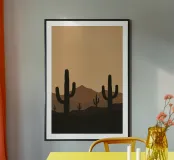 Paesaggio desertico monocromatico con sagome di cactus poster con telaio in legno