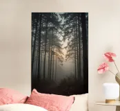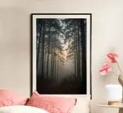 Paesaggio forestale con alberi alti e nebbia fitta poster con telaio in legno