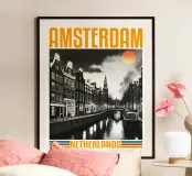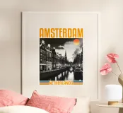 Panorama della città di Amsterdam anni '70, design classico e retrò poster