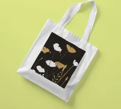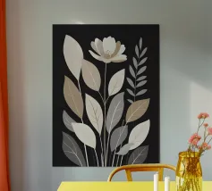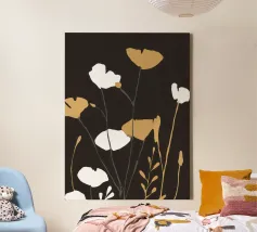 Un'opera d'arte floreale minimal di grande impatto, con fiori ocra dorati e bianchi nitidi sullo sfondo di un profondo carbone. L'elevato contrasto e le silhouette pulite evocano un senso di tranquilla drammaticità, perfetto per gli spazi interni moderni, industriali o monocromatici.