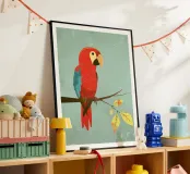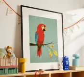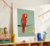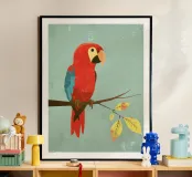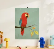 Pappagallo rosso appollaiato su un ramo circondato da foglie d'autunno poster con telaio in legno
