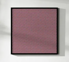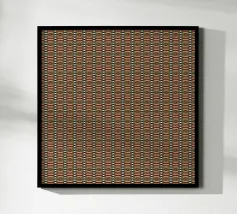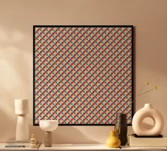 Un motivo ripetuto di linee diagonali e forme geometriche in vari colori. Il disegno utilizza tonalità audaci e contrastanti per creare un effetto visivo vibrante.