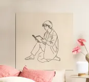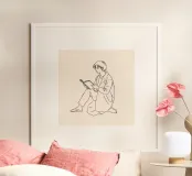 Persona che legge un libro seduta a terra in un ambiente informale poster con telaio in legno